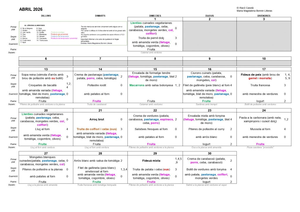 Ja tenim el menú del menjador escolar del mes de febrer. Link per descarregar el menú.